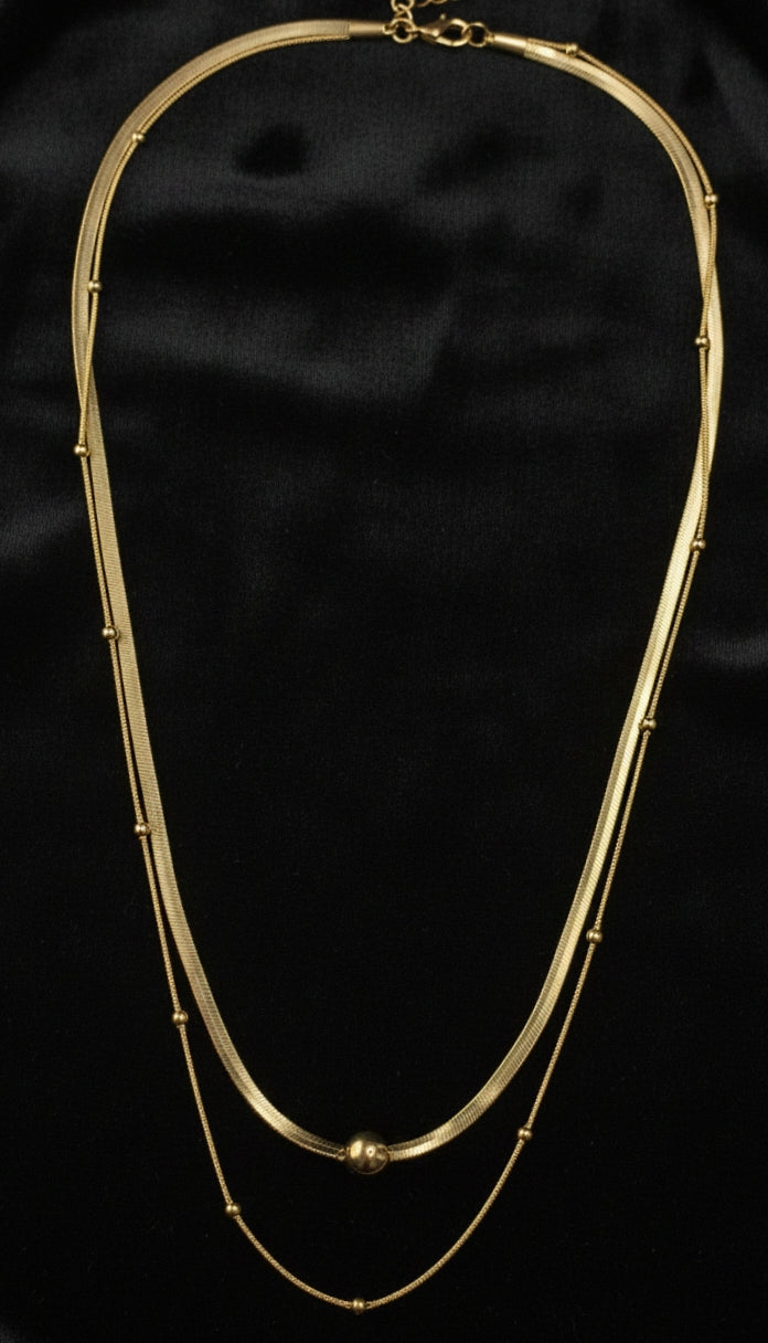 A graceful blend of minimal shine and modern layering, the Aurelia Layered Glow Necklace features a sleek dual-chain design accented with delicate gold beads and a polished centre sphere. Effortlessly elegant, it adds a refined glow to your neckline without overpowering your look.
