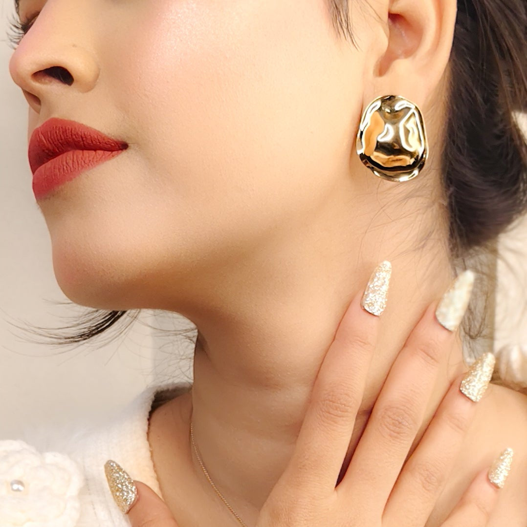 Minimal yet striking, the Aurélia Melted Gold Stud Earrings feature an organic, molten-gold silhouette that reflects light beautifully from every angle. Designed for modern elegance, these sculpted studs add effortless sophistication to both everyday looks and elevated evenings.