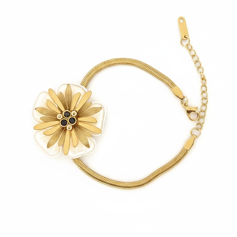 A graceful floral bracelet designed to sit delicately on the wrist, featuring a layered flower motif with soft white accents and a radiant gold finish. Its sleek band and adjustable chain make it a refined everyday piece with a hint of statement elegance.