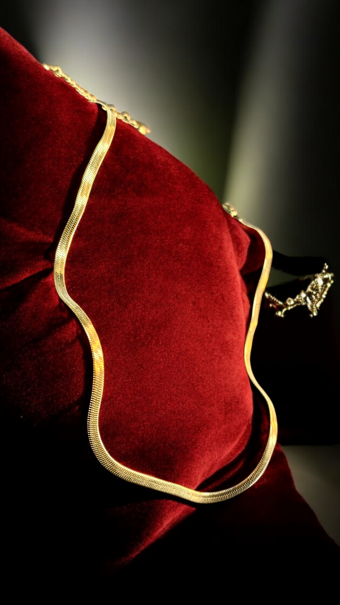 A timeless gold snake chain necklace designed to sit beautifully on your collarbone with a smooth, fluid finish. Minimal yet striking, Aurora Glide is the kind of everyday luxury that elevates even the simplest outfit—effortlessly chic, always in style.