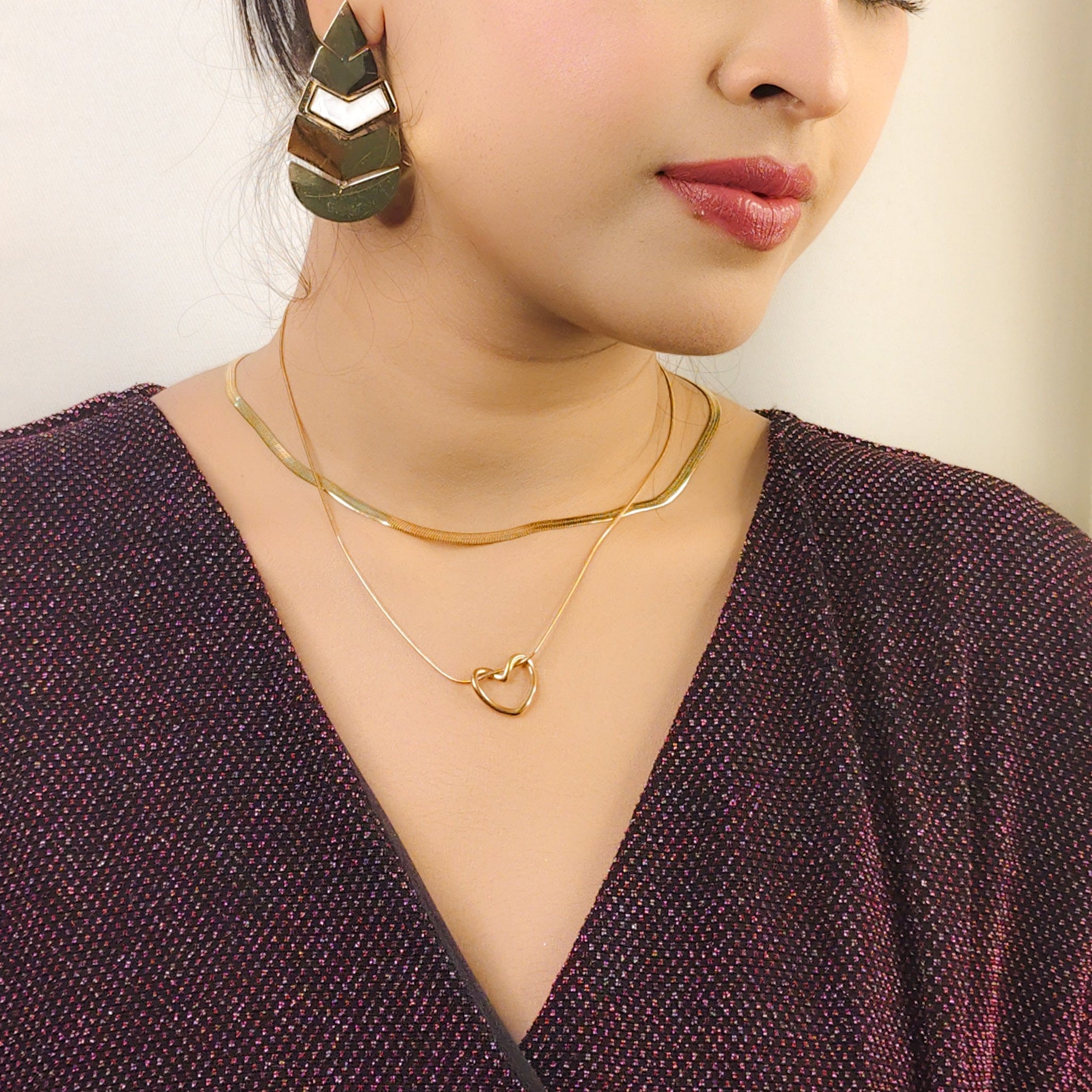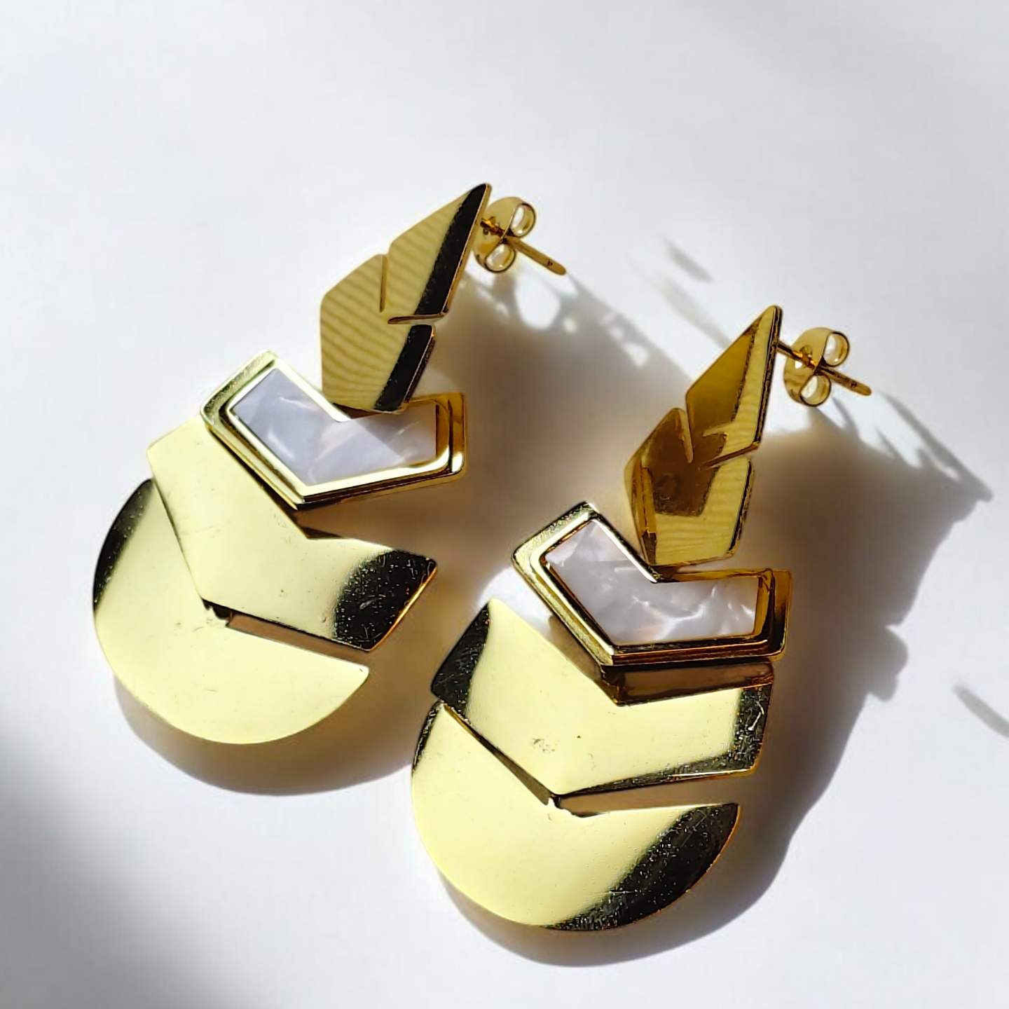 A striking blend of modern geometry and soft elegance, these chevron-inspired drop earrings feature layered gold-toned forms accented with a subtle pearly sheen. Designed to move beautifully with you, they add instant sophistication to any look.