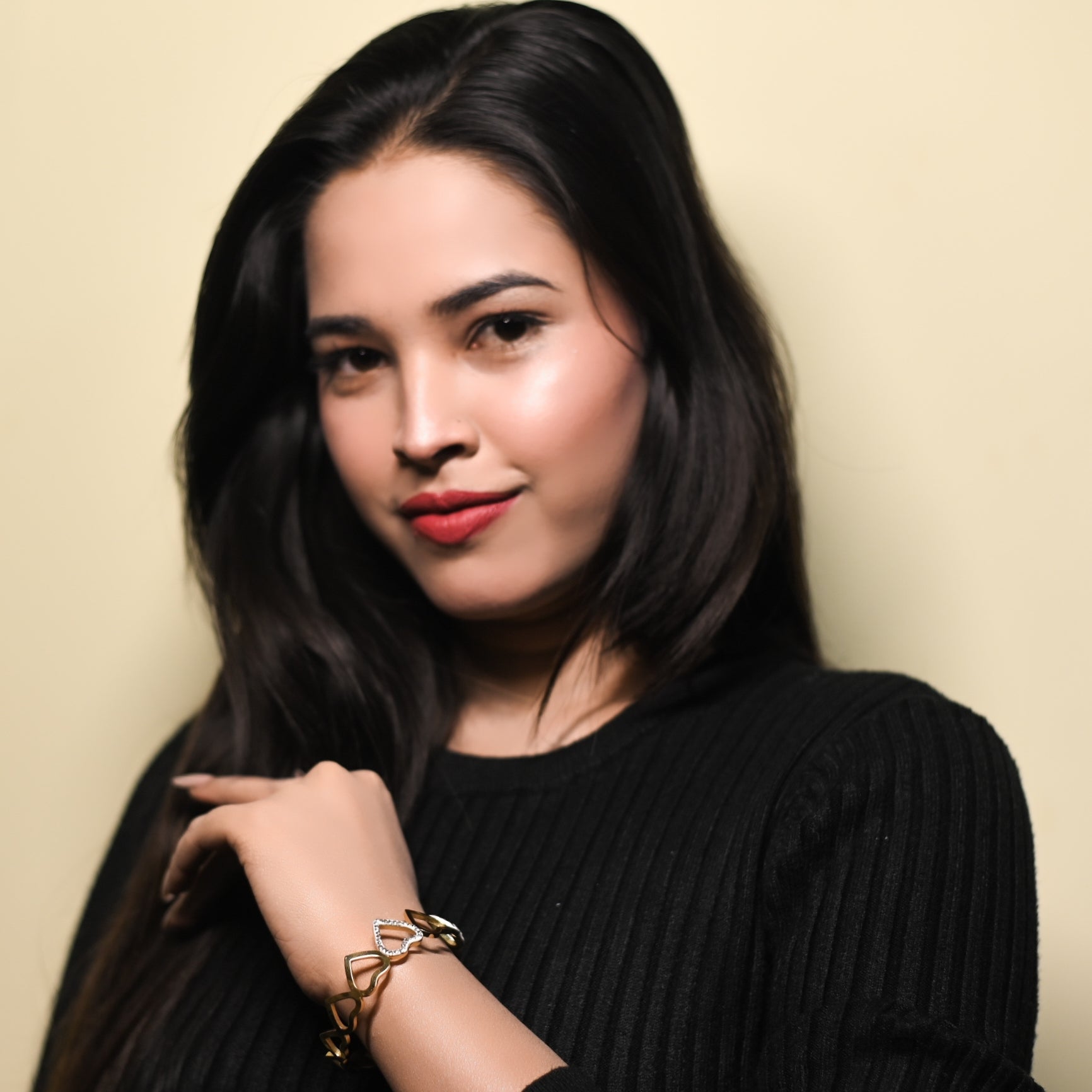 A romantic and contemporary bangle adorned with heart-shaped links, alternating between polished gold and crystal-studded outlines. Designed to celebrate love, elegance, and everyday glamour.