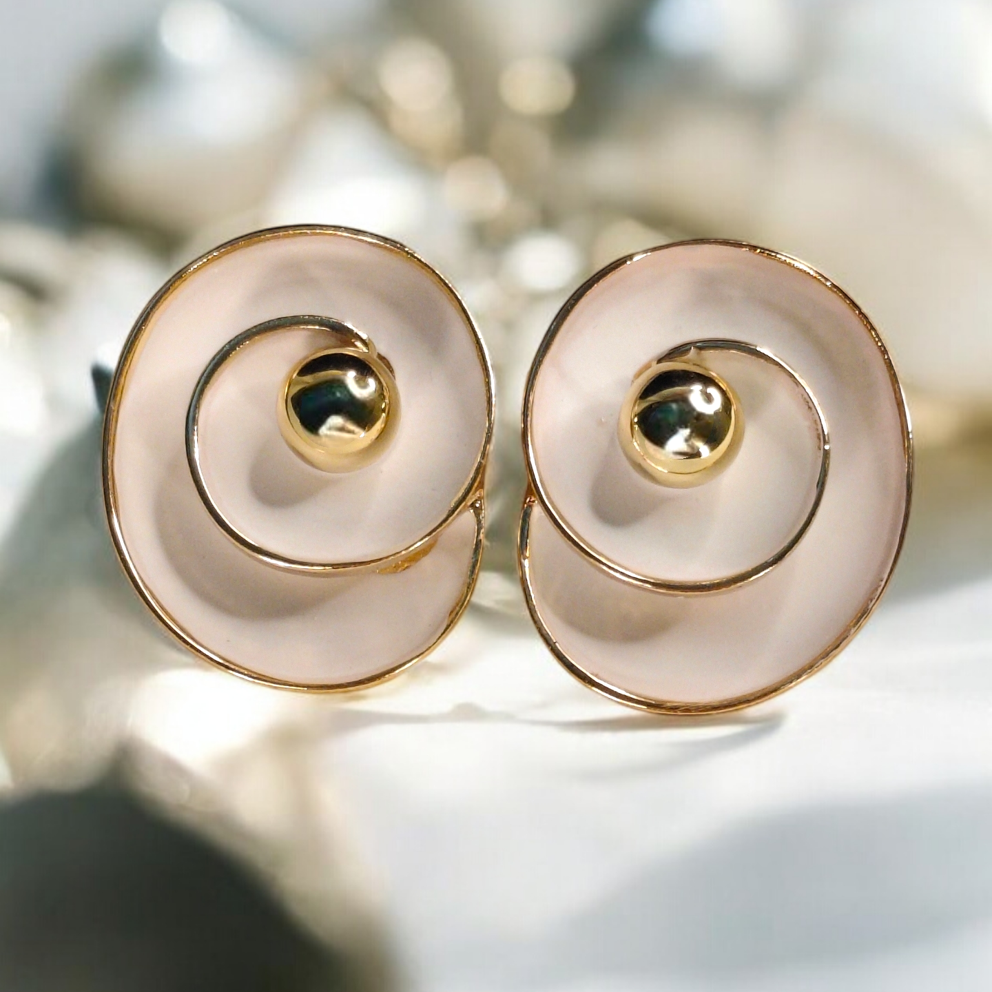 A sculptural pair of stud earrings featuring a soft ivory-toned spiral design outlined in gold, finished with a polished golden centre. Minimal yet striking, these earrings bring modern elegance with a hint of artistic charm.