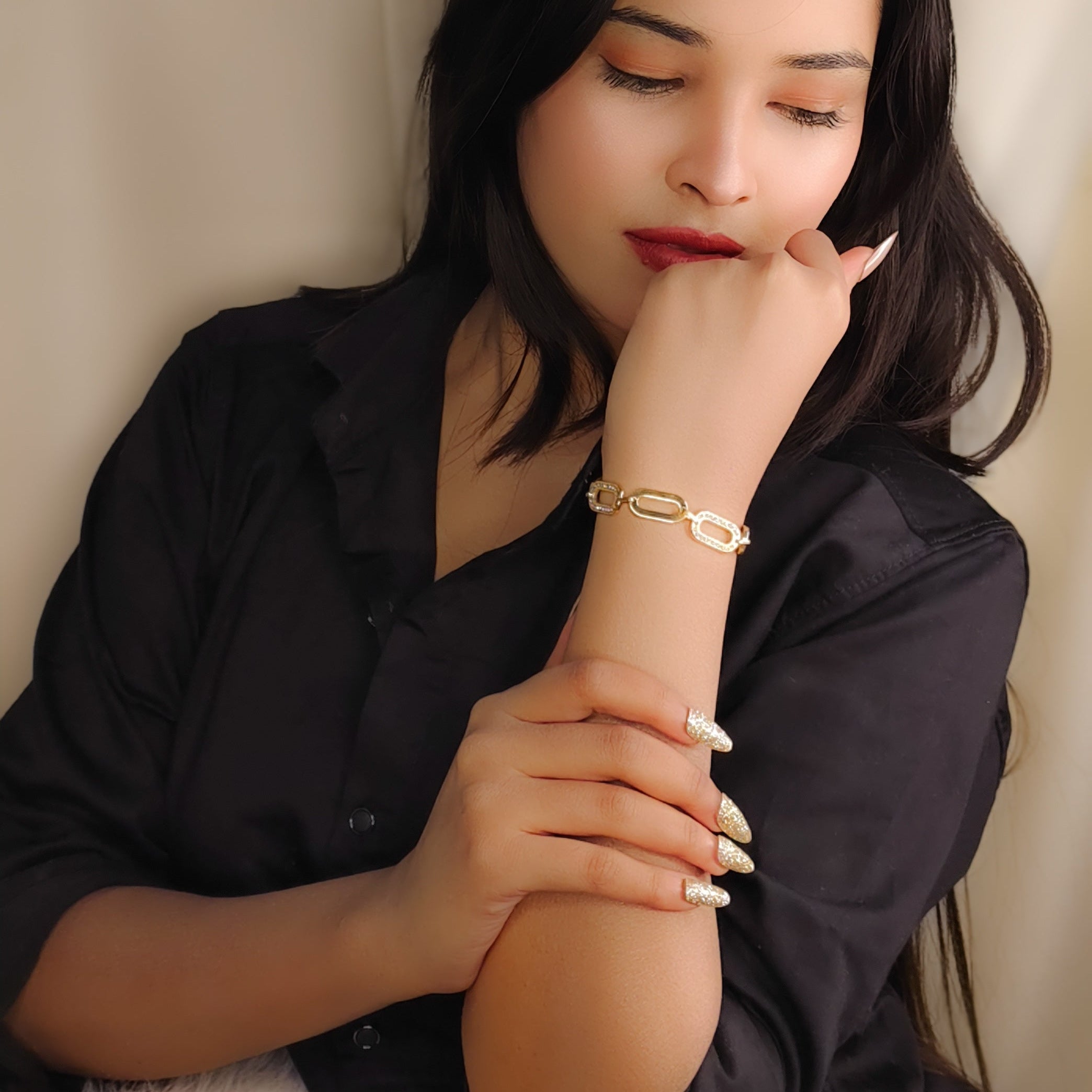 A refined statement bracelet crafted with elongated gold-toned links, accented with crystal-embellished segments that catch the light beautifully. Designed to balance modern geometry with soft elegance, this piece elevates everyday styling with effortless charm.
