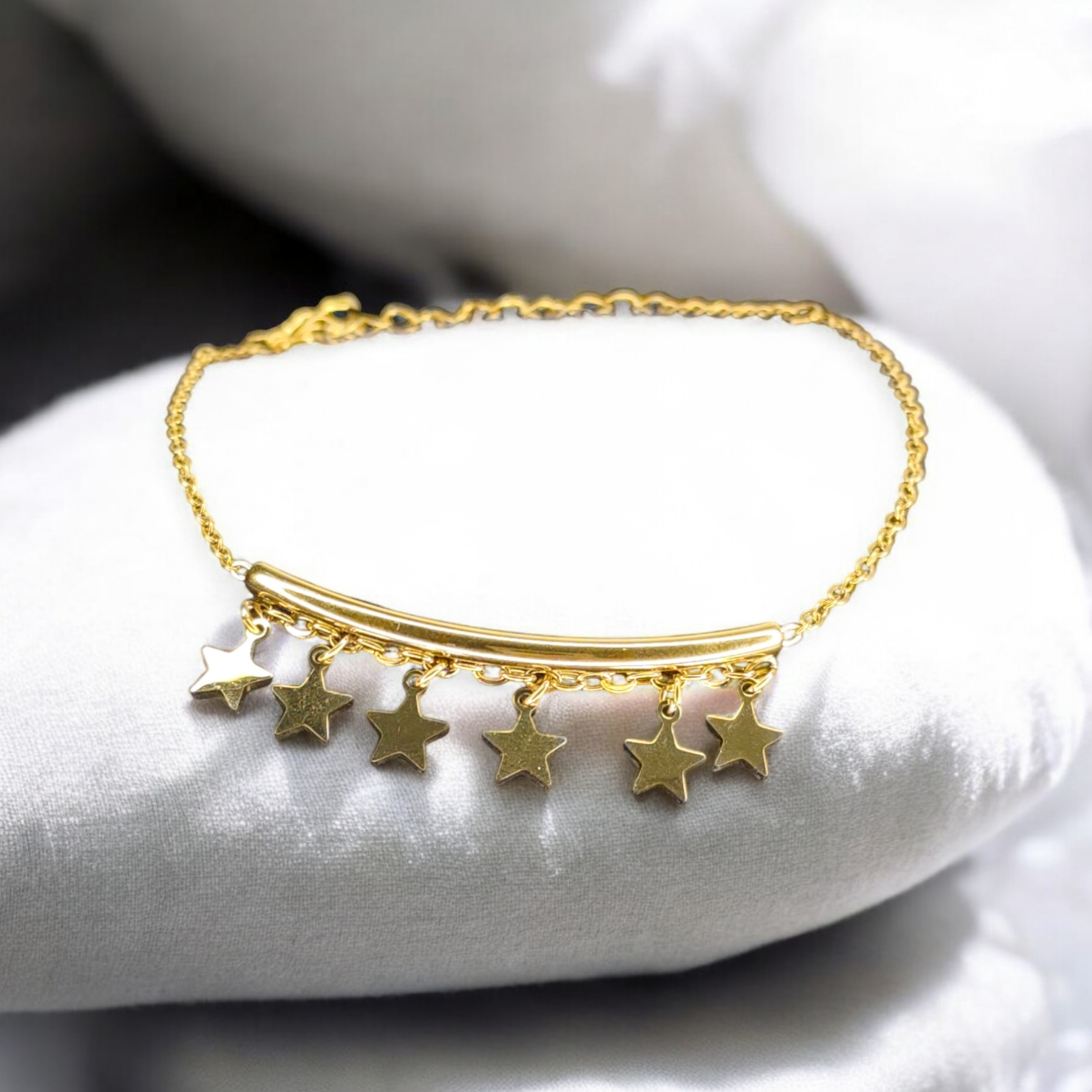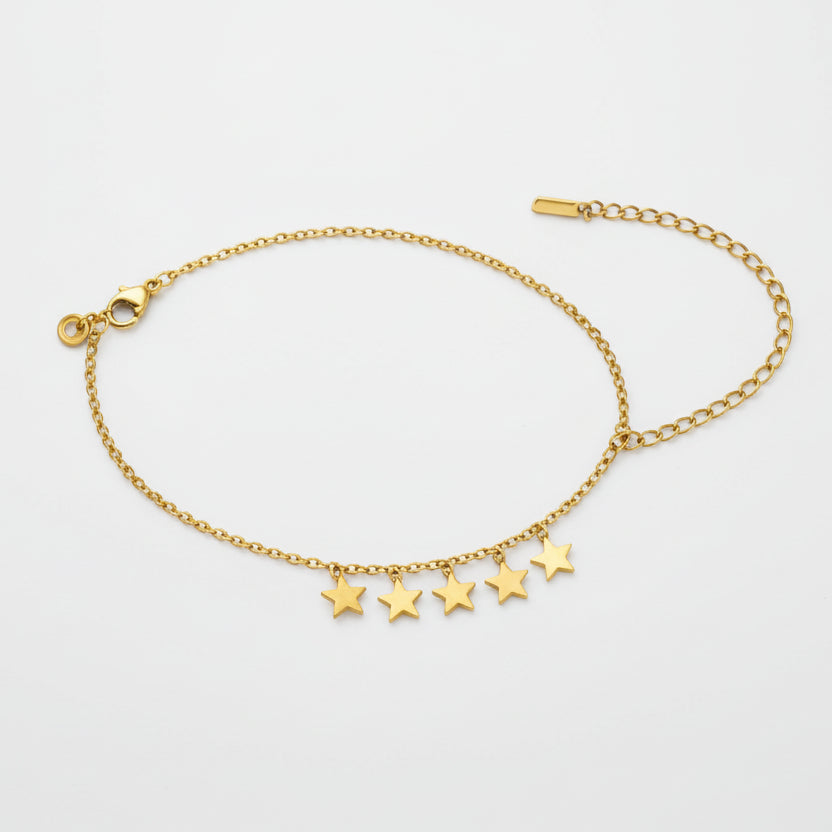 A delicate gold-toned anklet featuring dainty star charms that rest gracefully along the ankle. Lightweight and minimal, it adds a soft shimmer with every step, making it perfect for everyday elegance and subtle statement styling.